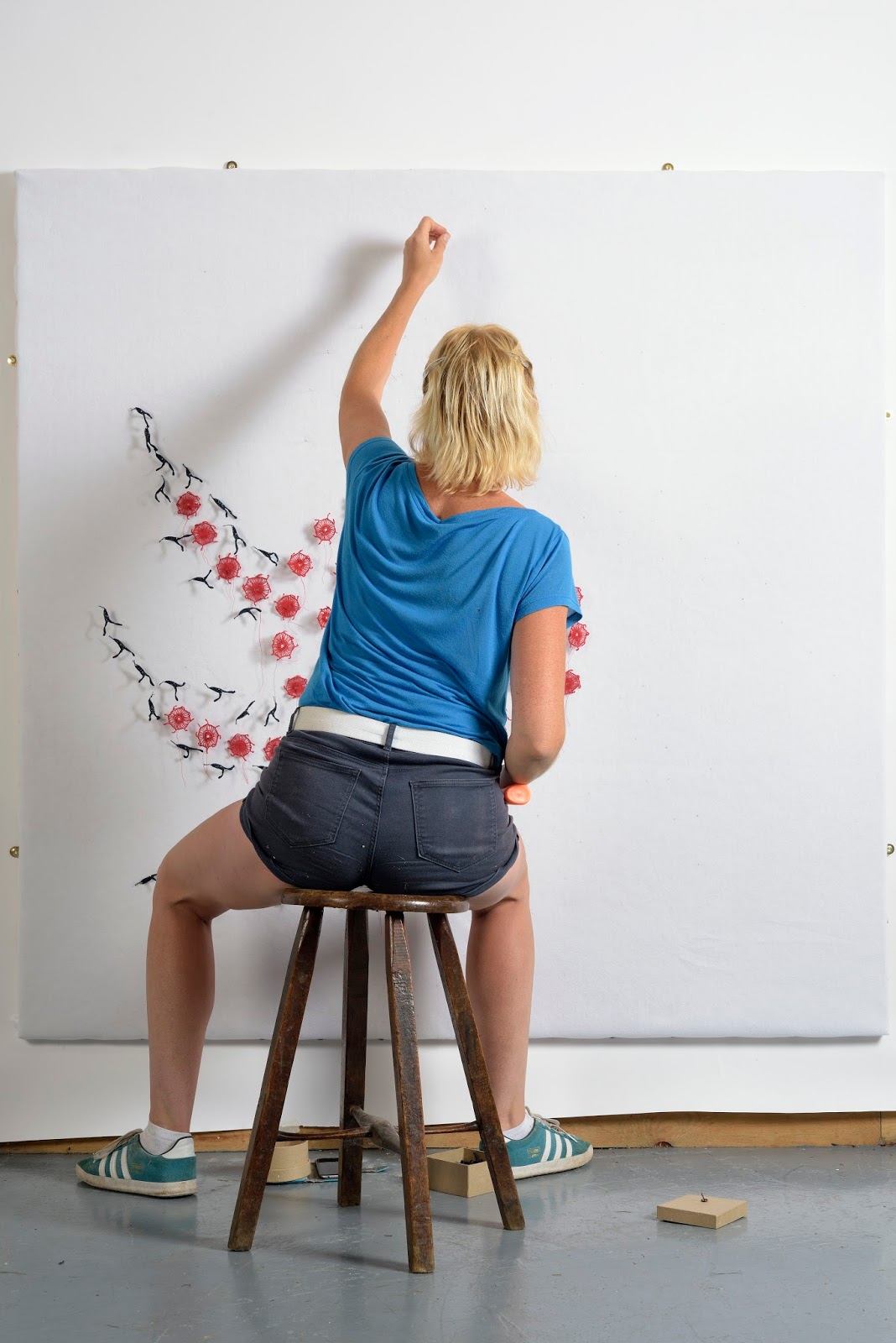 'Under Attack' is composed of small red bacterial cells crocheted in heavy gage sewing thread and then crocheted antibodies in navy mercerized cotton all of which are pinned to the wall in a fibonacci based pattern reflecting the cell form.